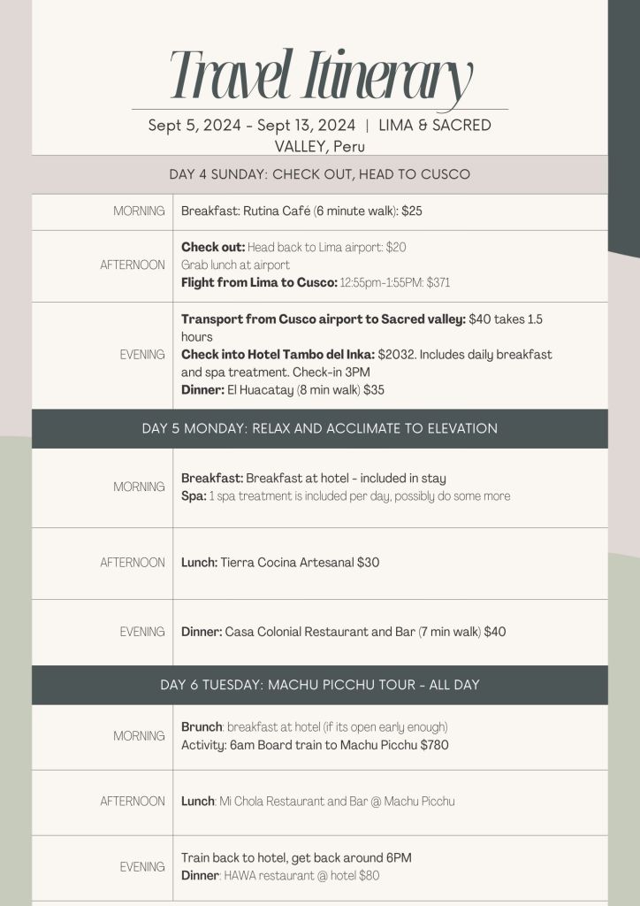 This is the travel itinerary we used for Peru with budget! I added a link for a downloadable version so you can modify it for your trip.