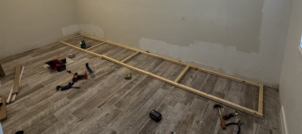 Once the support blocks were secured, I nailed the upper trim directly into the 2×2 pieces — not into the IKEA unit itself.