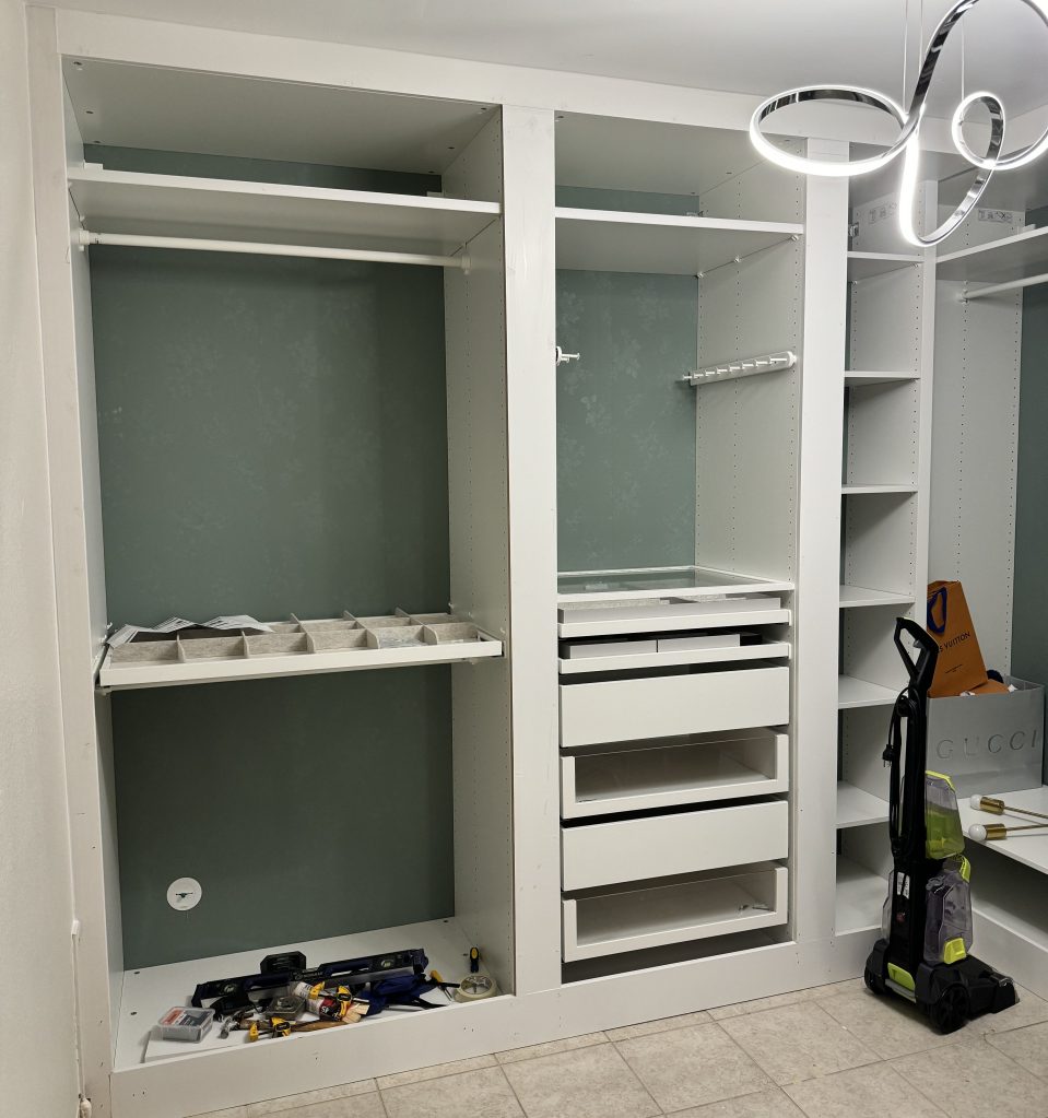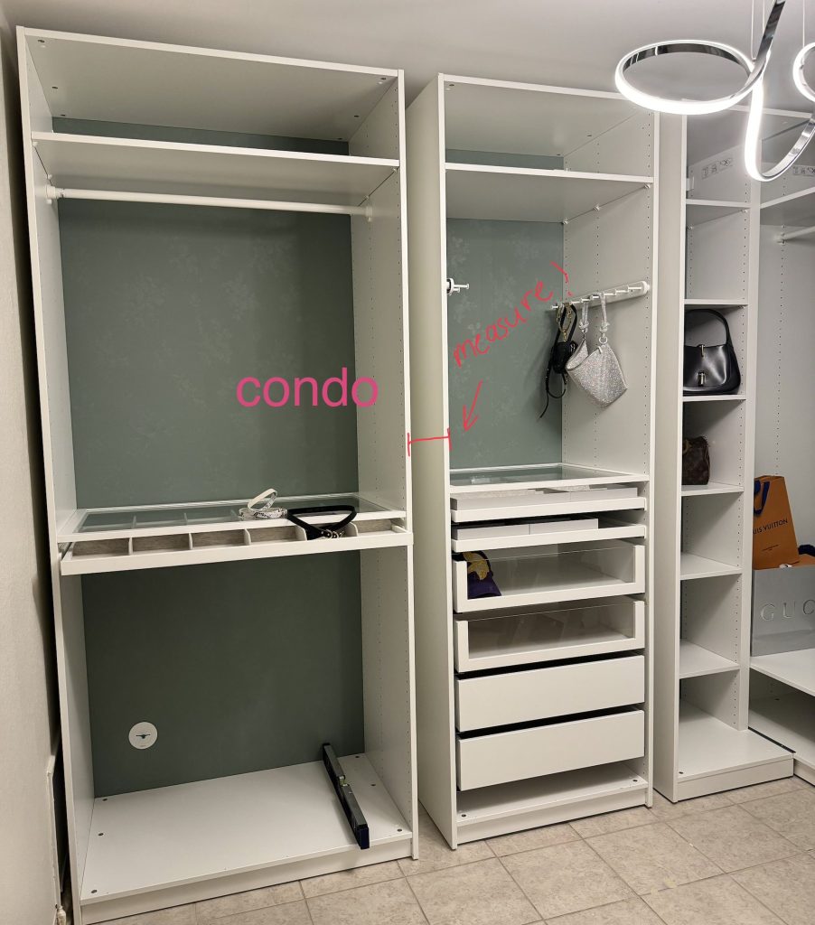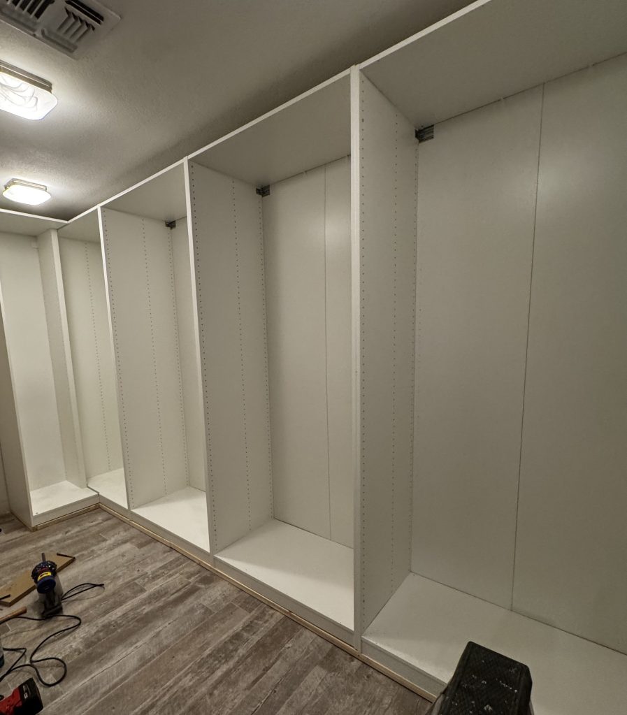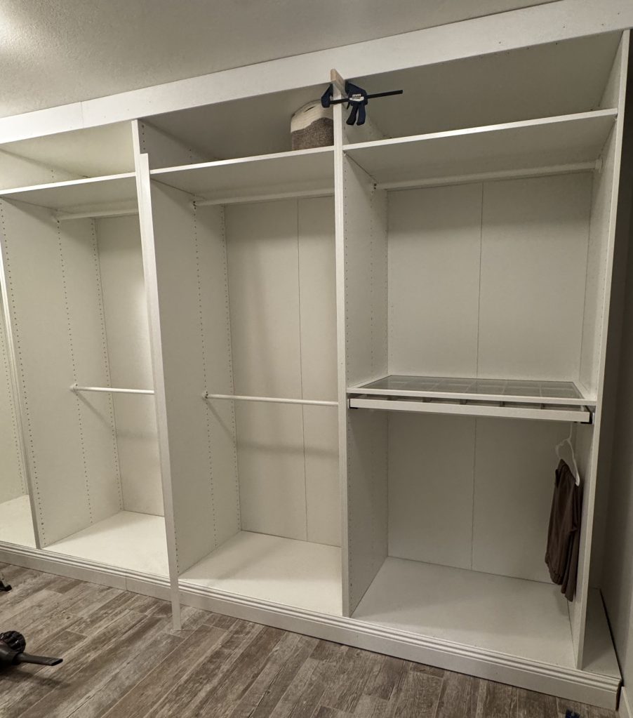 My baseboards were too tall, so instead of raising the units properly, I added a shelf on the lowest rung inside each unit to visually lift everything. It looked fine, but it was a more expensive workaround because I had to buy an extra shelf for each PAX unit. If I did it again, I’d just build the base from the start (which is what I did in my house).