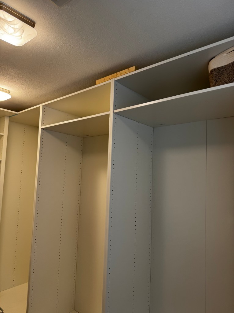 Because the PAX units don’t sit flush with the ceiling, I needed something solid to attach the top trim to. You can’t just nail trim into thin IKEA particle board and expect it to hold.